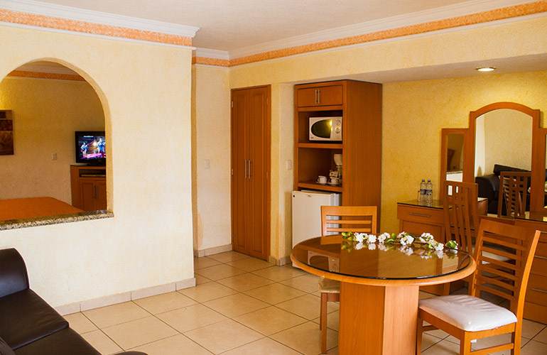 Nuestra Junior Suite cuenta con una cama King size para 1, 2 o 3 personas, sofá cama ajustable, televisor LCD por cable, reproductor de DVD, cerradura e iluminación electrónica, aire acondicionado y calefacción, caja de seguridad, escritorio de trabajo, frigobar, horno de microondas, cafetera, secadora para cabello e internet inalámbrico.