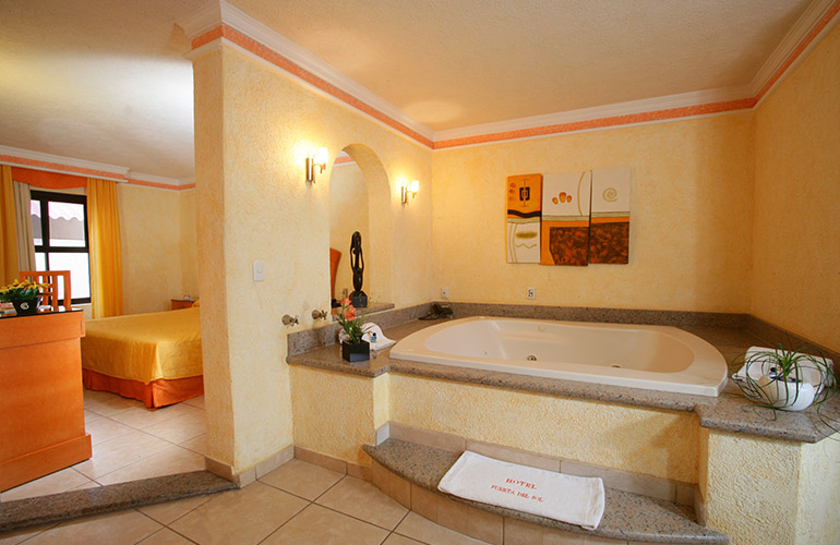 Nuestra Suite Platino cuenta con una cama King size y un jacuzzi por lo cual es la favorita para celebrar una ocasión especial, una noche de bodas o una noche de relajación total, además cuenta con televisor LCD por cable, reproductor de DVD, cerradura e iluminación electrónica, aire acondicionado y calefacción, caja de seguridad, escritorio de trabajo, batas de baño, frigobar, horno de microondas, cafetera, secadora para cabello e internet inalámbrico